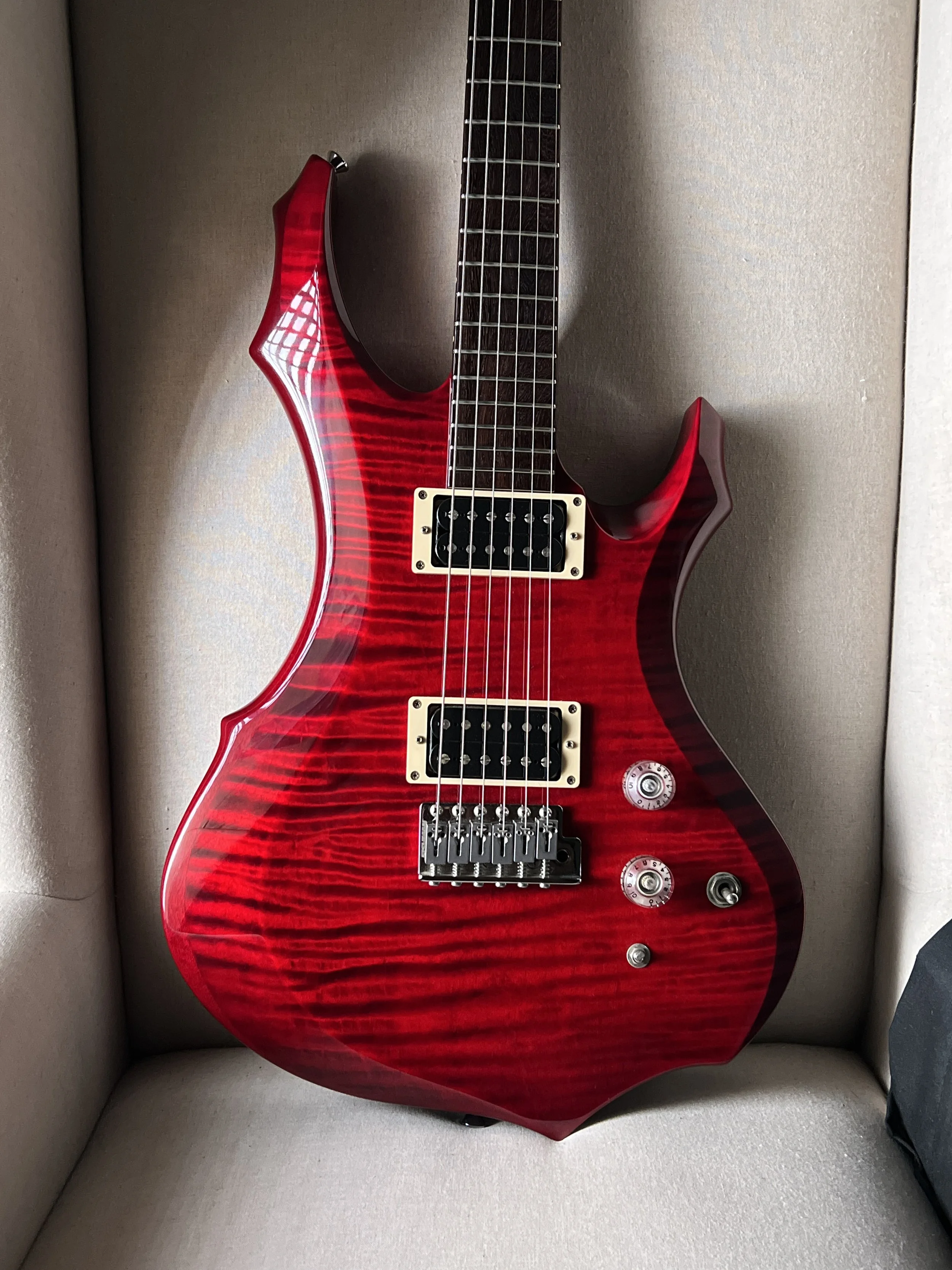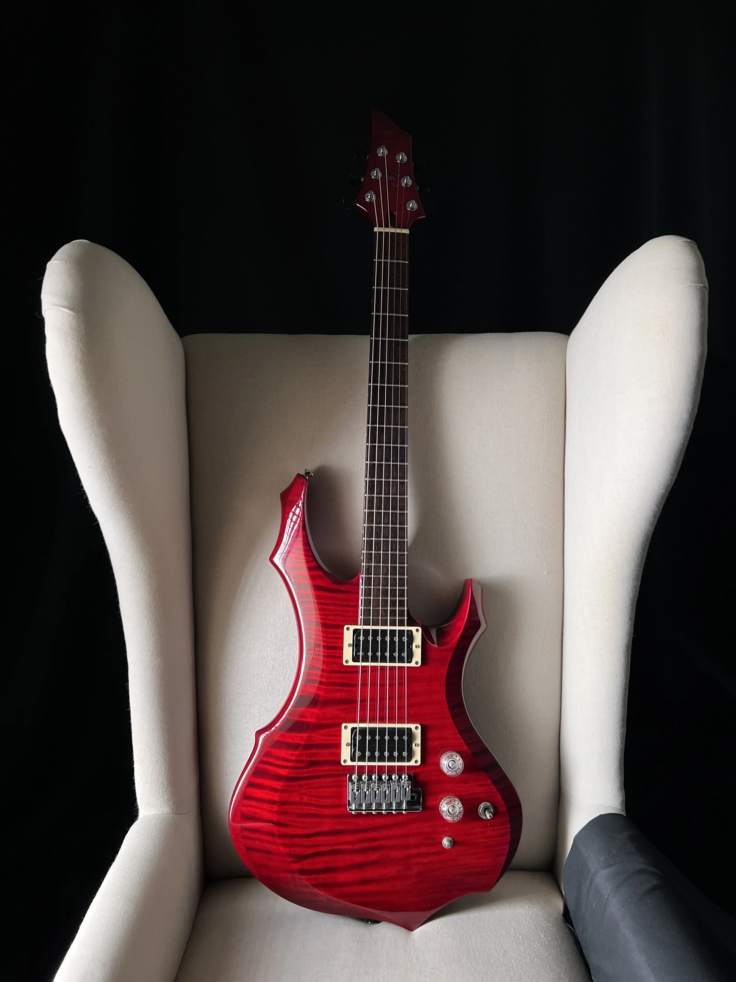 A nice guitar from the ESP Technical House, where custom orders and one-off type guitars were made, often for notable artists. This is a Forest model from 2011, with a beautifully figured one-piece maple top and comprehensive electronics package.